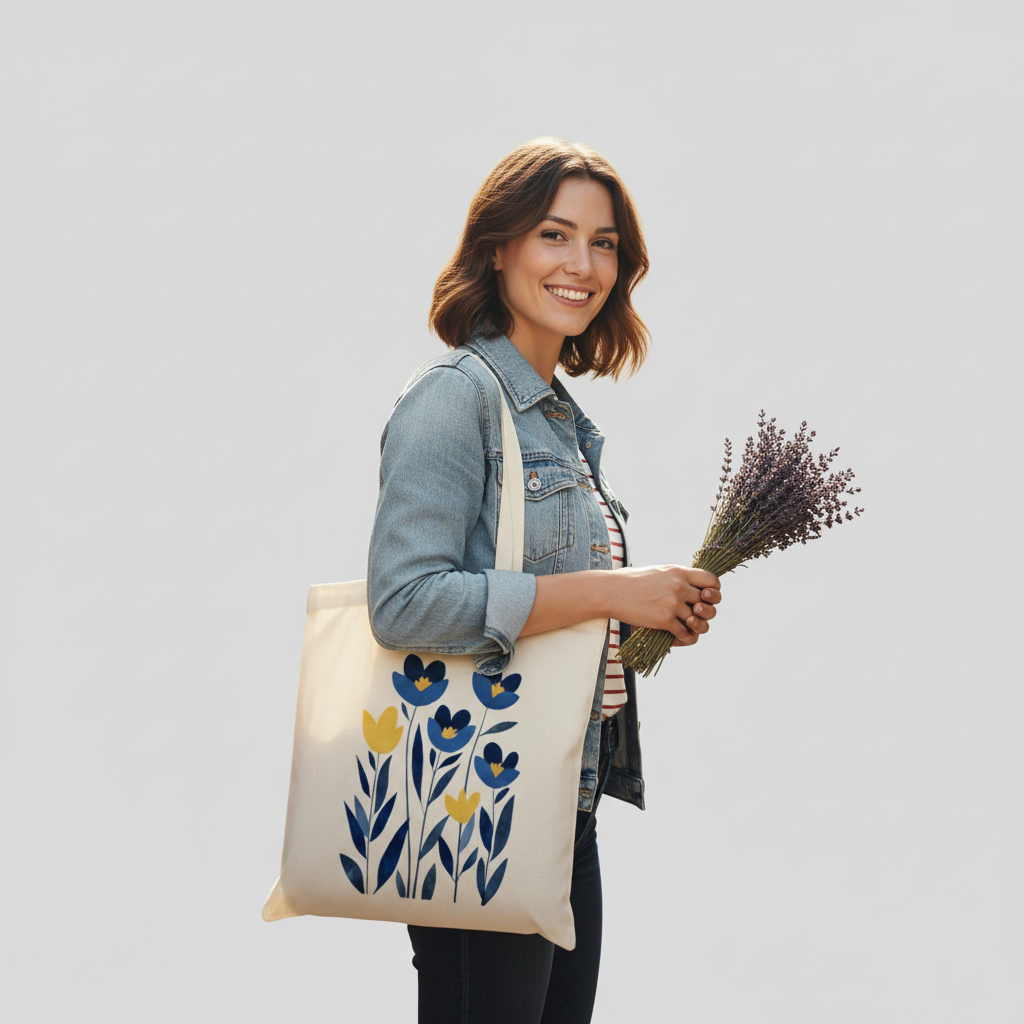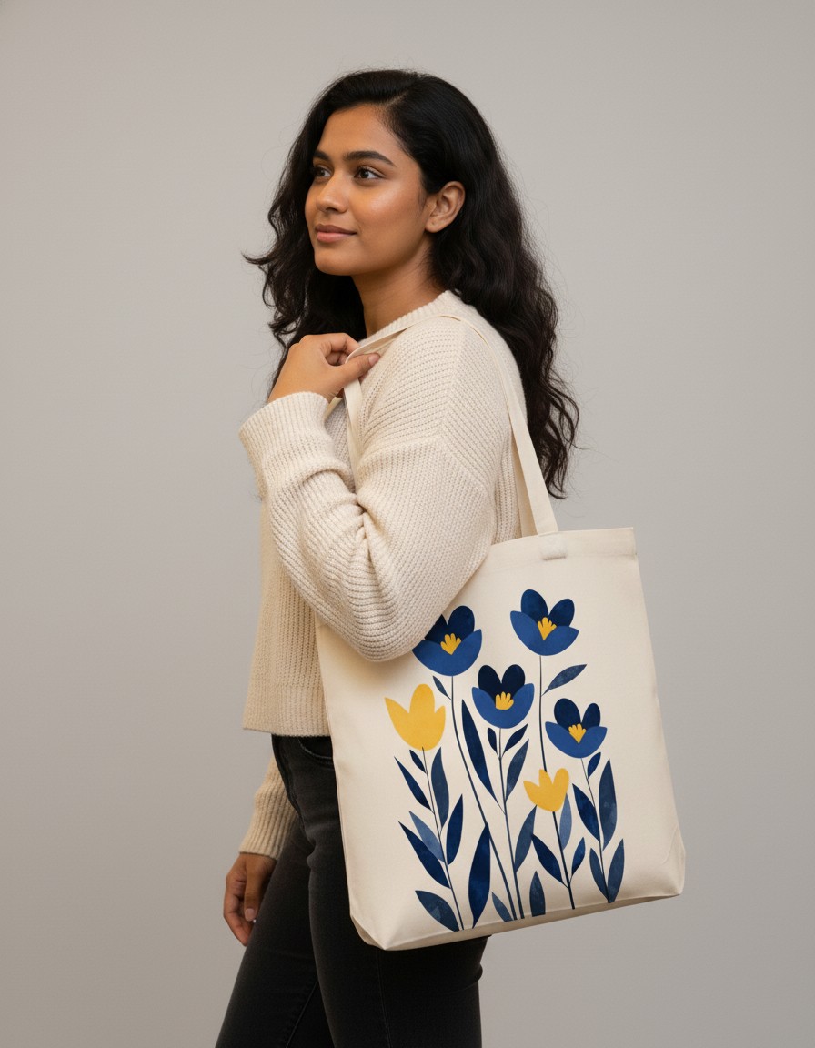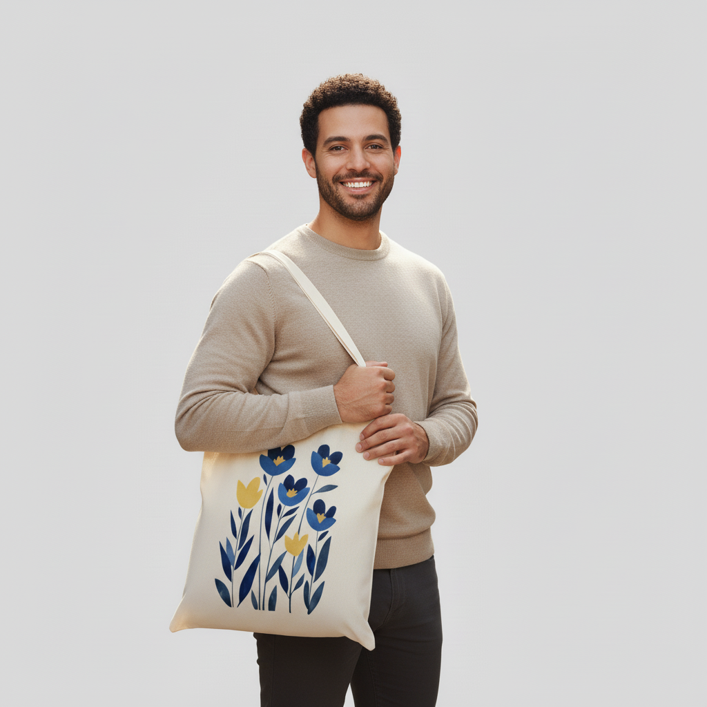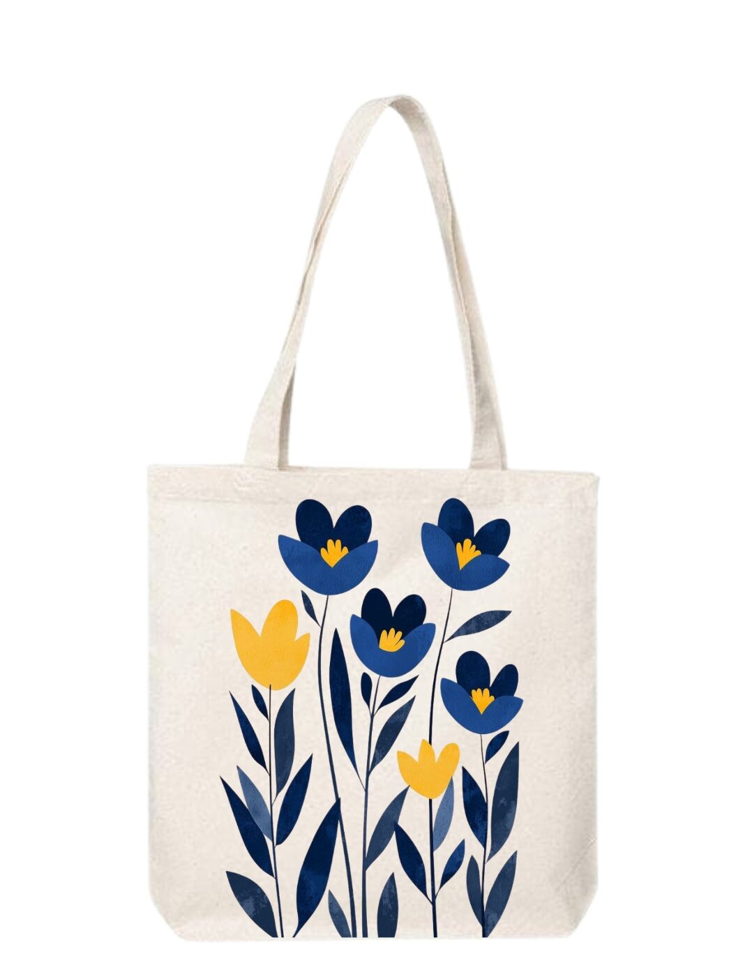 Carry art with purpose. The Bloom Essence Tote combines timeless minimalism with a touch of nature’s poetry. Crafted from premium cotton canvas, it’s light yet durable — perfect for everyday use, from casual outings to creative sessions. The deep navy and warm yellow florals symbolize calmness meeting optimism, giving your daily style a fresh and effortless charm.
