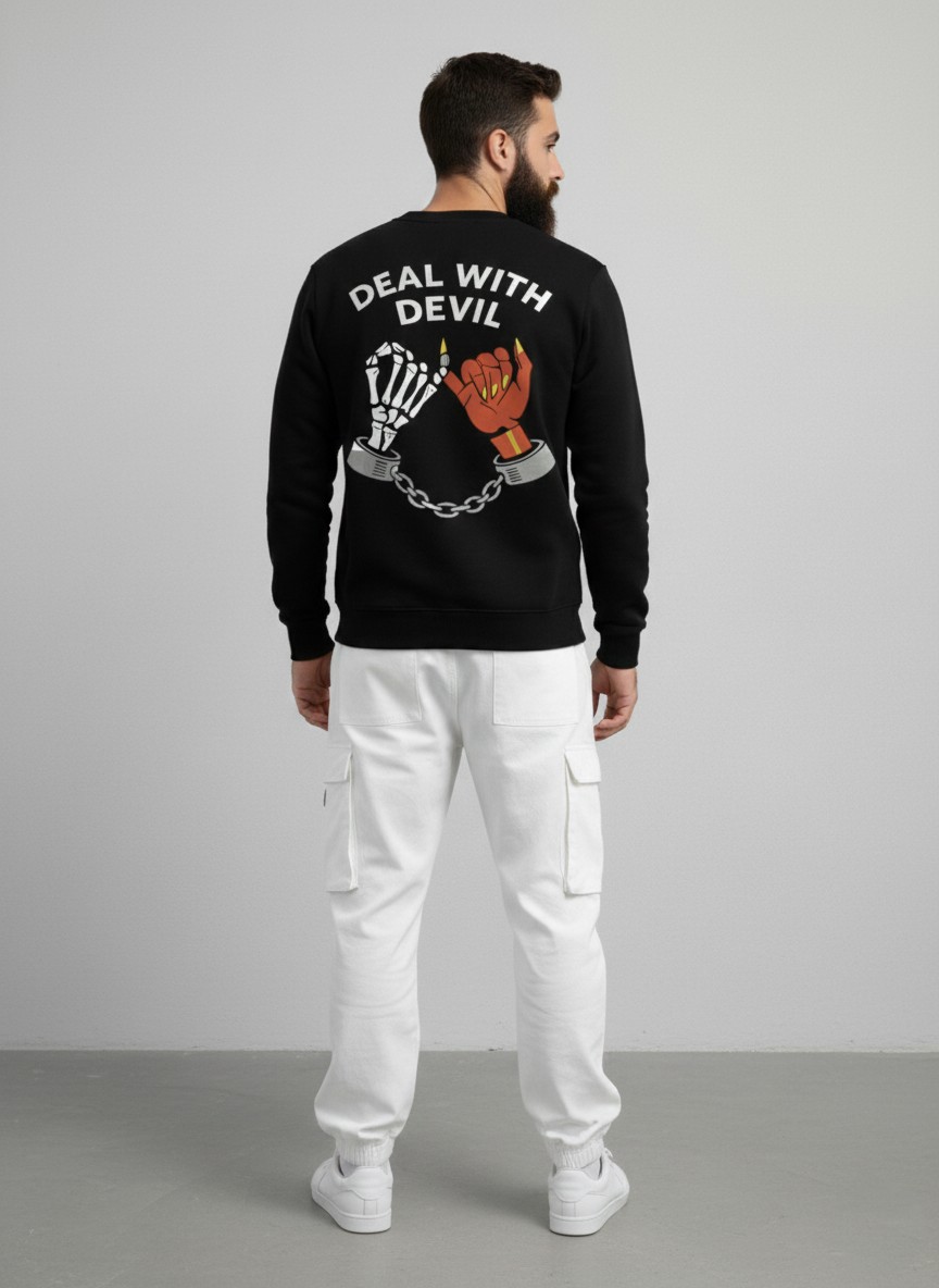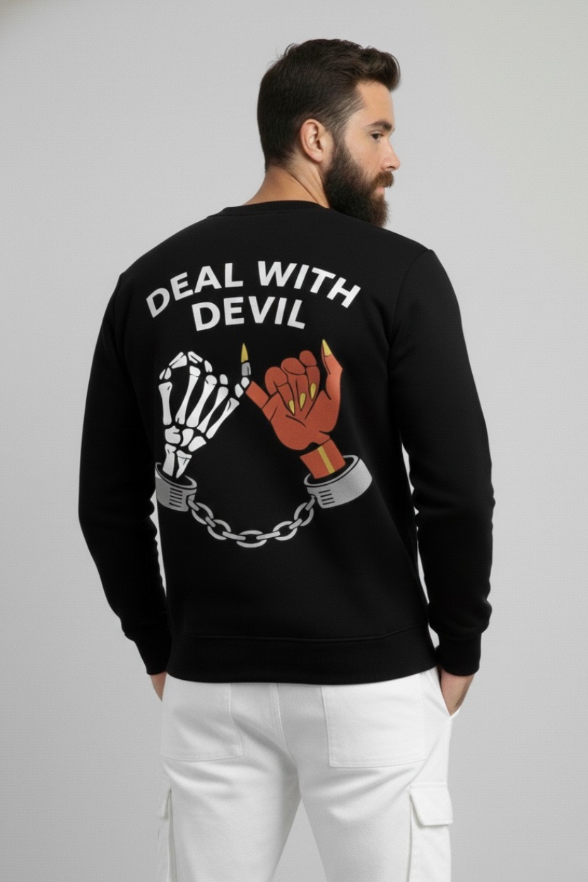 Deal With Devil – Bound by Choice Sweatshirt is crafted for men who walk their own path without fear. The minimal front skull emblem represents inner strength and rebellion, while the bold back artwork tells a deeper story of duality, choice, and consequence. The chained skeletal hand and devil hand symbolize the constant battle between discipline and desire a reminder that power comes from owning your decisions. Made with premium fabric and a structured silhouette, this sweatshirt blends comfort, confidence, and street attitude into one timeless piece.