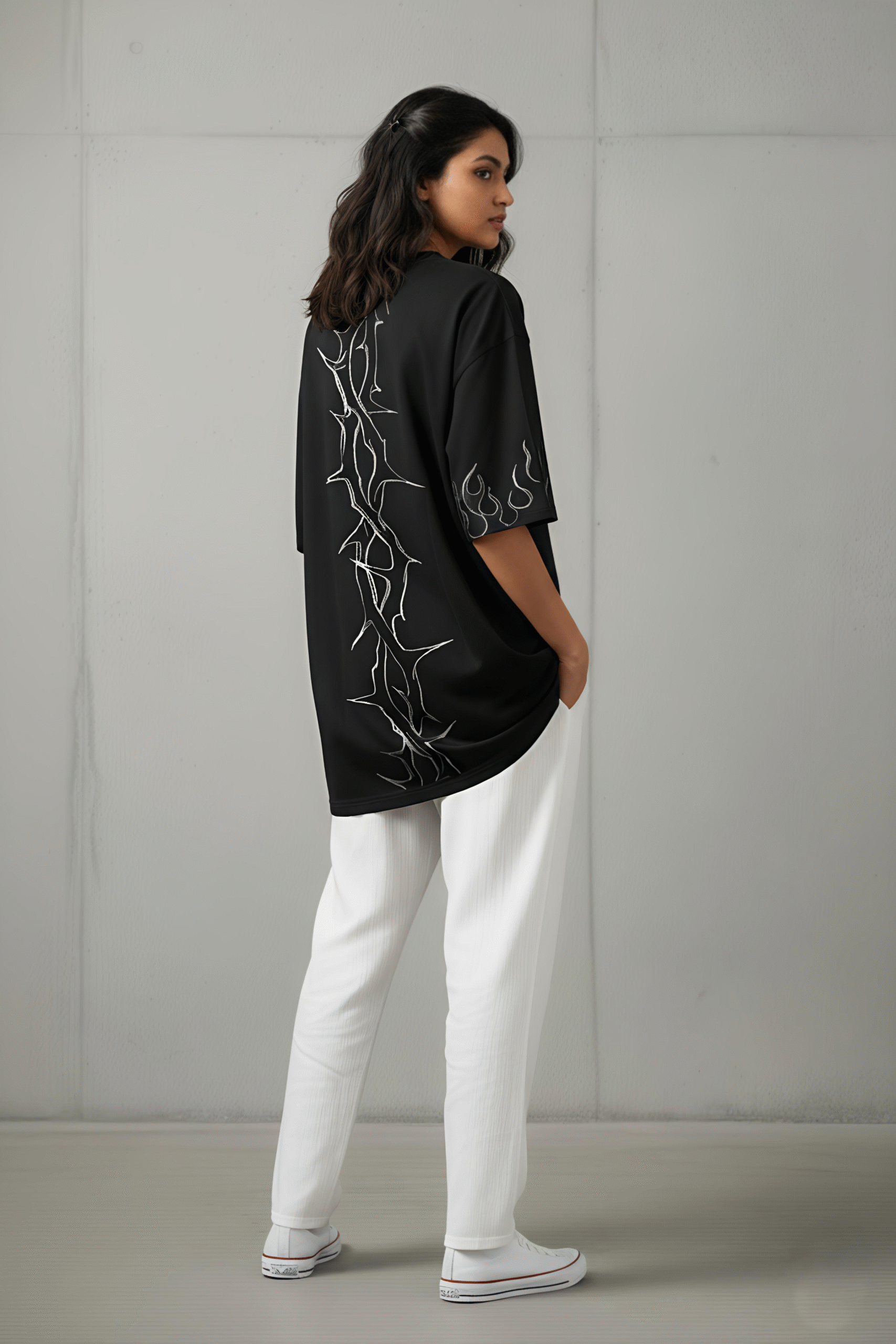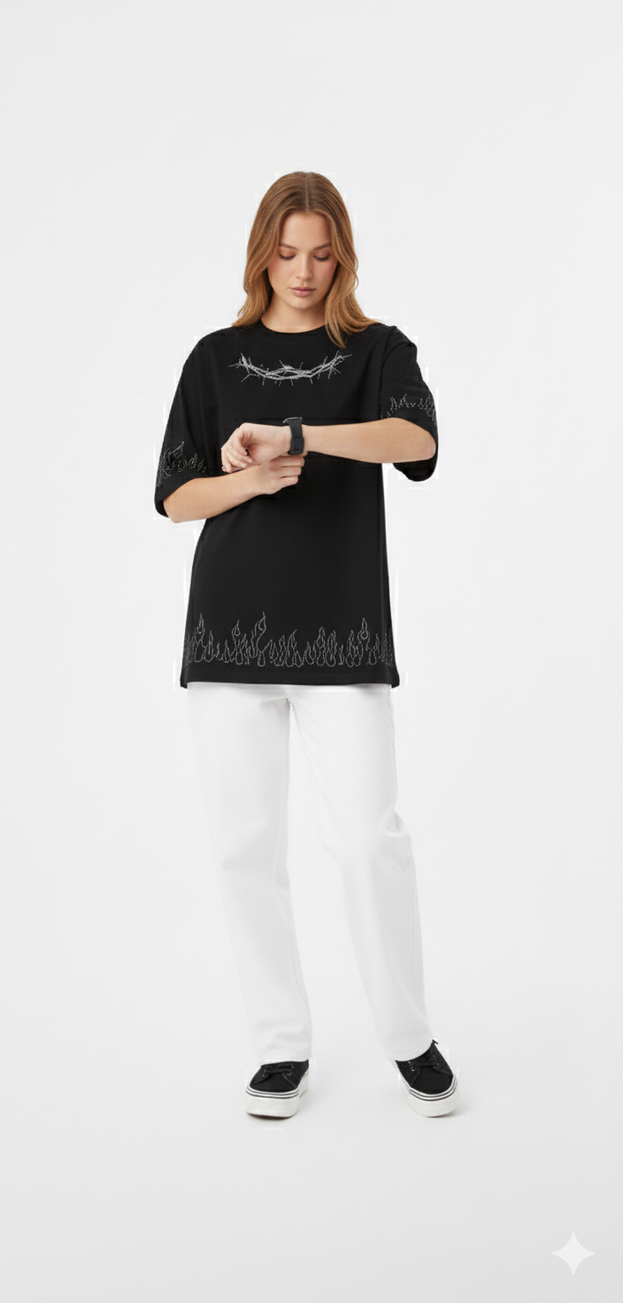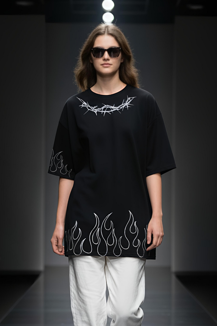 Unleash effortless style with the Inferno Oversized Tee where comfort meets attitude. Designed with premium cotton-blend fabric, this statement piece features sleek flame-inspired artwork that flows across the sleeves and hem, creating a bold, modern aesthetic. The oversized silhouette ensures a relaxed, gender-neutral fit that drapes naturally on every body type.